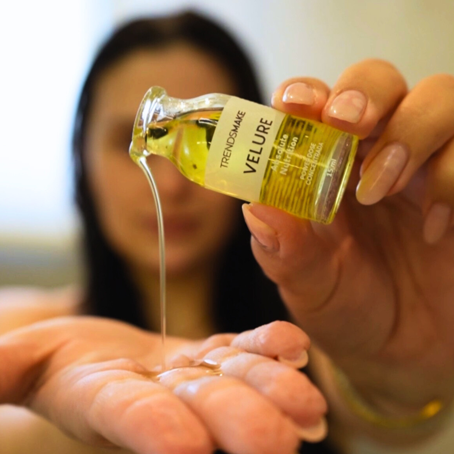 Coloque a ampola na palma, esfregue uma mão na outra e sinta a textura se transformar em uma máscara cremosa. O calor das mãos ativa os ativos, deixando-a pronta para aplicar nos fios.