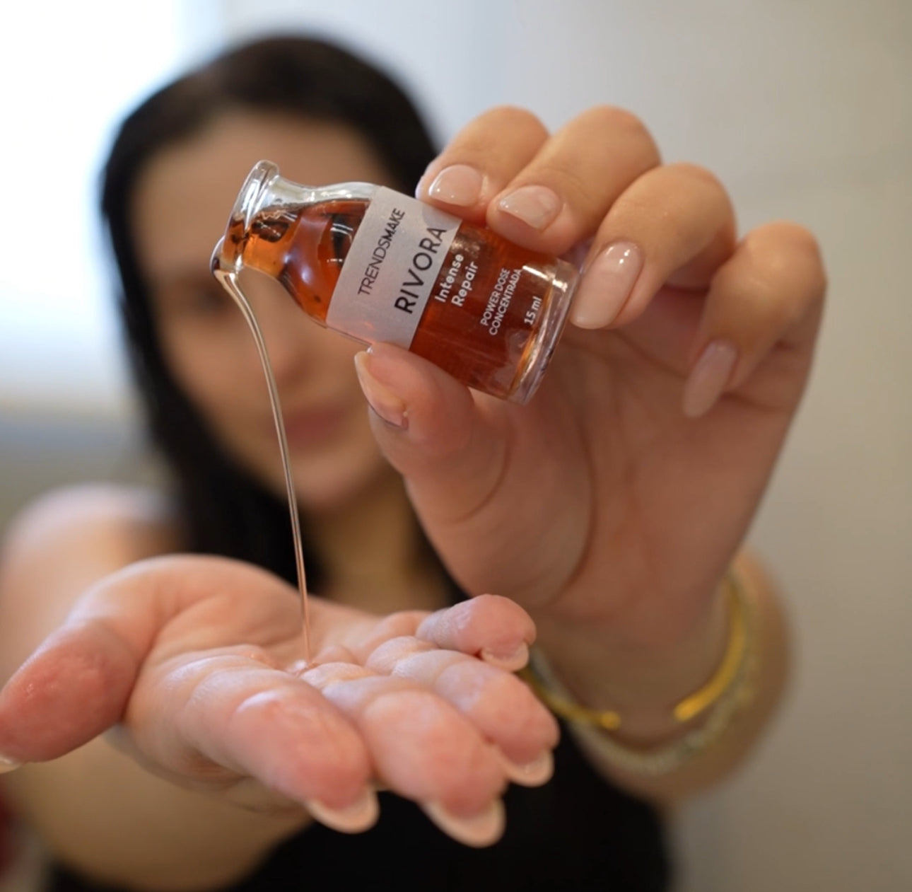 Coloque a ampola na palma da mão, esfregue uma mão na outra e sinta a textura se transformar em uma máscara cremosa. O calor das mãos ativa os ativos, deixando-a pronta para aplicar nos fios.