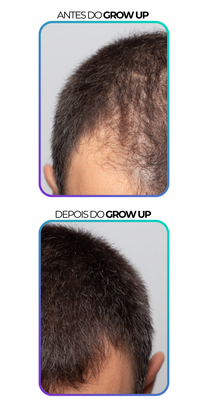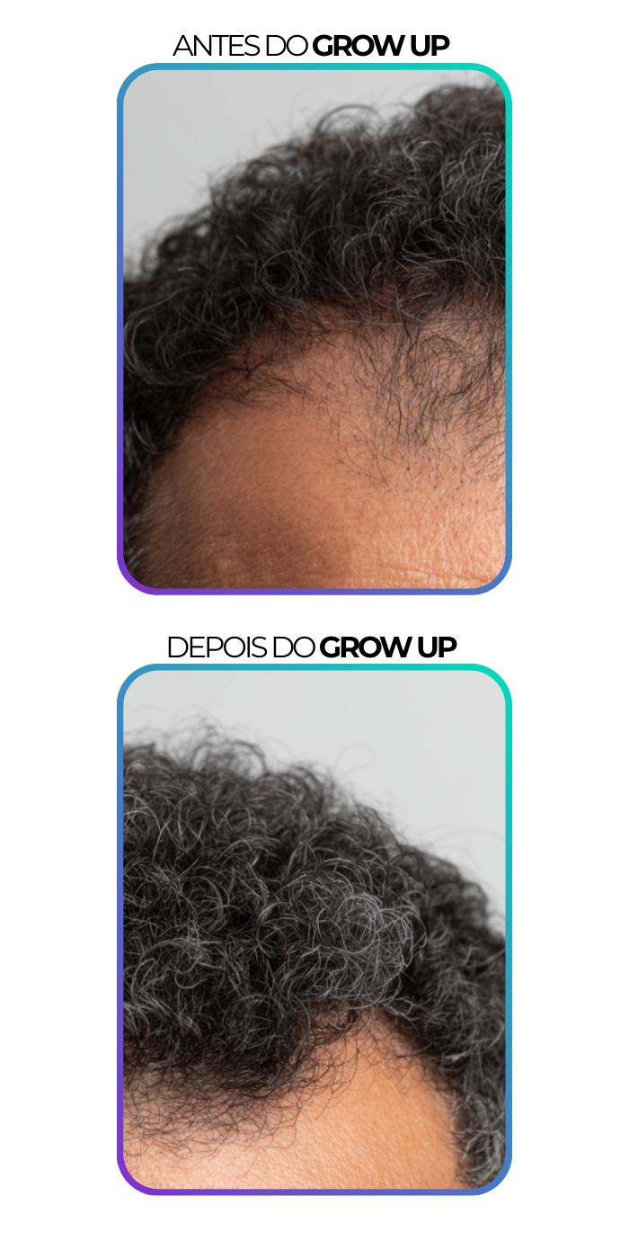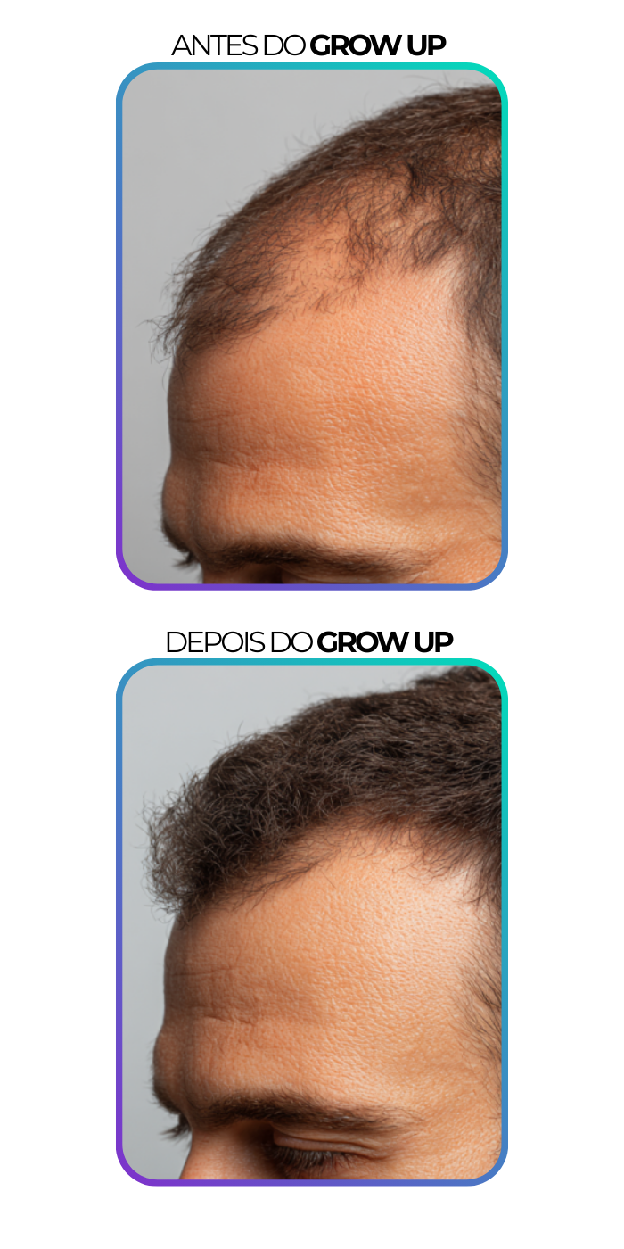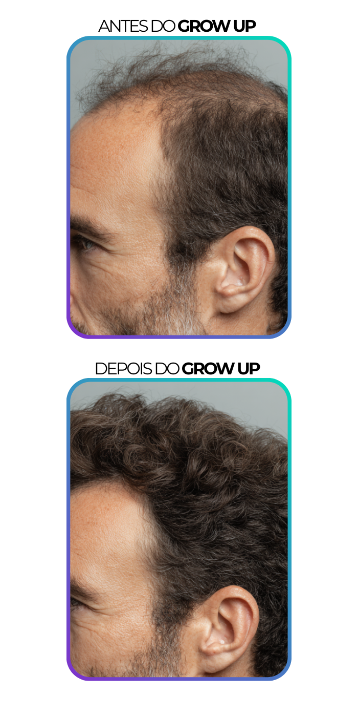 Achei que minha calvície não tinha mais jeito… usei o Grow Up e em poucas semanas já vi fios novos. Hoje meu cabelo está mais cheio e recuperei minha confiança.