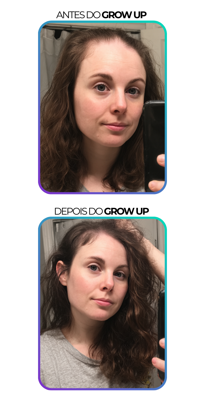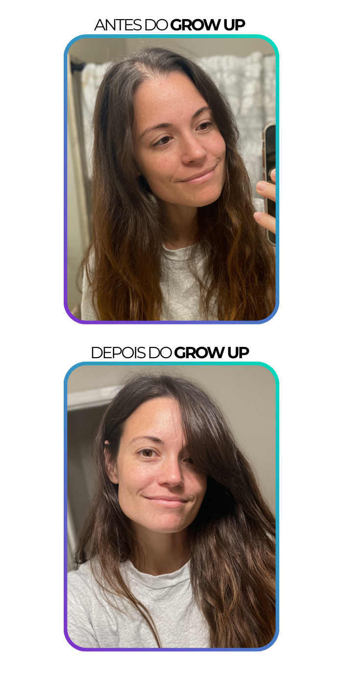 Eu tinha falhas na frente do cabelo e achava que nunca ia recuperar… Com o Grow Up, em 2 meses já vi fios novos e até a oleosidade do couro cabeludo ficou controlada.